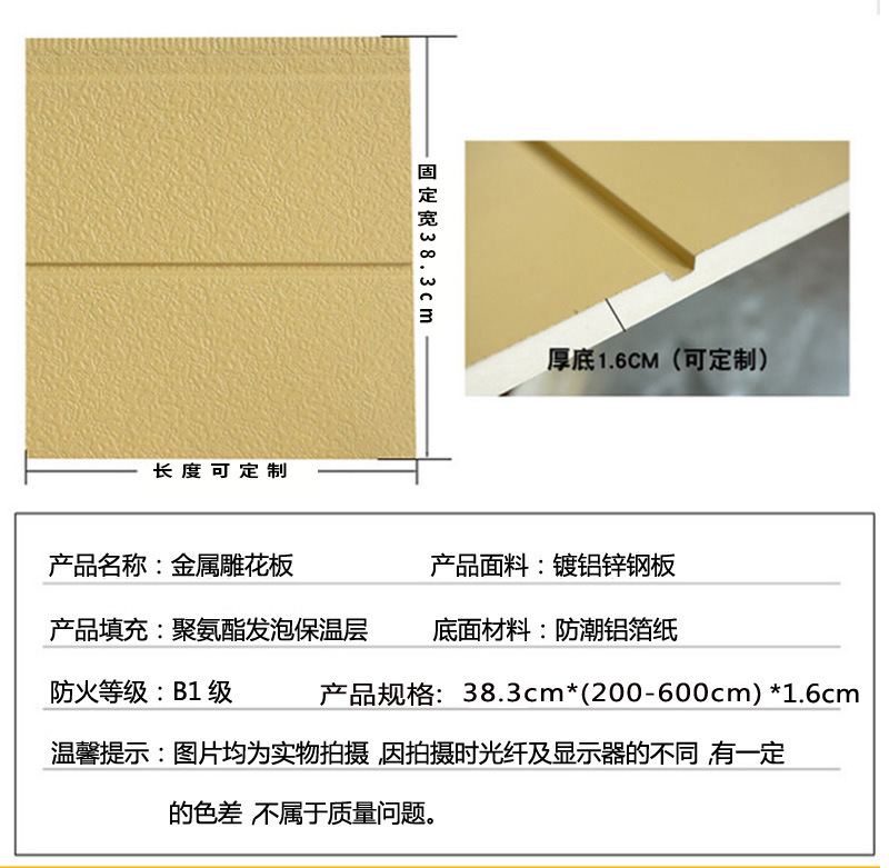 金属雕刻板表面是经过特殊层处理的彩色压花饰面金属板,中间层是经过阻燃处理的硬质高密度聚氨酯泡沫保温隔热层,底面是起保温作用的铝箔保护层,保温防潮。因为墙板本身具有保温隔热、防水阻燃、轻质抗震、施工方便、隔音降噪、绿色环保、美观耐用等特点,由于其板卡组装方式简单实用,不受季节环境的限制,所以安装使用非常安全方便,适合四季使用。浮雕有100多种图案和颜色。华丽美观的装饰效果使建筑凸显品位和品位。简单灵活的拆装方式,使墙体设计的更换更加方便。该板不仅适用于新建砖混结构、框架结构、钢结构、轻质房等建筑外墙的保温装饰,而且适用于既有建筑的装饰节能改造以及室内外装
