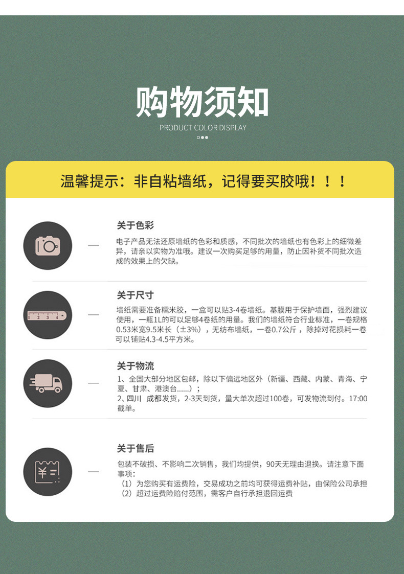 电子产品无法百分百还原墙纸的色彩和质感,不同批次的墙纸也有色彩上的细微差异,请亲以实物为准哦。建议一次购买足够的用量,防止因补货不同批次造成的效果上的欠缺。