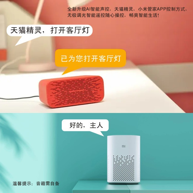 5:AI语音智能:小爱同学与天猫款,都有语音控制与手机APP,同时送有无极调光的遥控器,兼容了无极的所有功能。