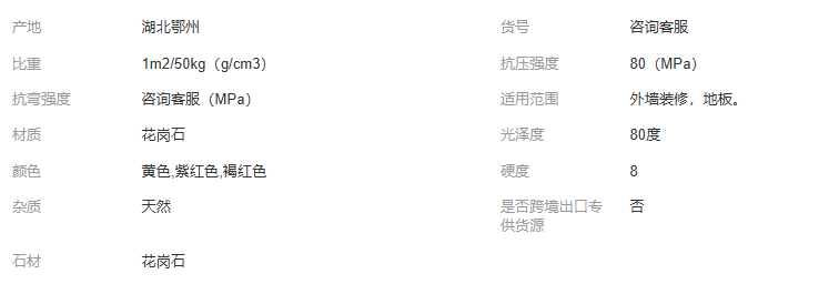 当前页为供应湖北新品种花岗岩:紫点灰麻  黄罗麻 , 紫罗麻价格信息展示,该页所展示的供应湖北新品种花岗岩:紫点灰麻  黄罗麻 , 紫罗麻批发价格、供应湖北新品种花岗岩:紫点灰麻  黄罗麻 , 紫罗麻报价等相关信息均有企业自行提供,供应湖北新品种花岗岩:紫点灰麻  黄罗麻 , 紫罗麻价格真实性、准确性、合法性由店铺所有企业完全负责。百信建材网对此不承担任何保证责任。