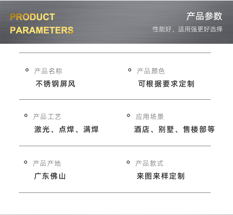| 饰面材质 | 不锈钢 | 型号 | 不锈钢屏风 | 可否定做 | 可以 |